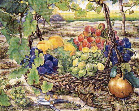 1946年生まれ。大阪市立大学卒。5年程前に始めた水彩画が楽しくて暇を見つけては筆を持っています。第十回春日水彩画展入選。第三回大阪を描こう展特選。●制作意図/私は毎年秋になるとぶどう畑へいってとりたてのぶどうを描くのが楽しみです。畑の向こうに稲穂が色づき始める頃、甘酸っぱいぶどうの香りの中で描いた作品です。一粒一粒の瑞々しい輝きを表現してみました。