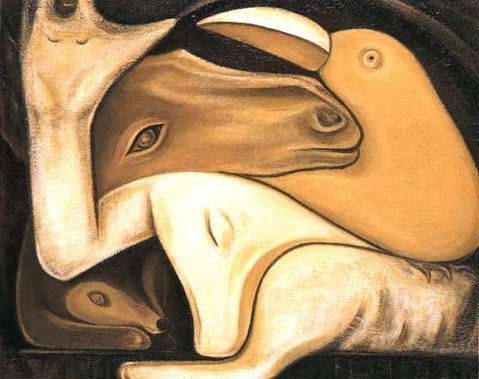 1947年生まれ。20年絵から離れていたので、残りの時間が気になります。上達する手順は諦めて目に見えないこと、言い出せないことなどを描けたらと思っています。●思いつくまま描きます。途中で少し恍惚となると、画題を決めますが、不完全で力が尽きます。「降り注ぐ言葉」を描く前に犬が死にました。見えない、歩けなかった彼女に、ガンジスの聖水をかけてやりました。