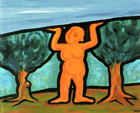 武蔵野美術大卒。16〜17年間SPコピーライター及びプランナーとして会社勤め。現在は無職。しかもけっこうイイ線いっている(?)のに独身。面白い仕事を探している。●ほんとうはとても美しい空。未来を感じさせる空。それを支えるのは・・・・・。母なる力、女のパワーか。自然の大きさと女性のたくましさを重ねて制作。実はぼおっと青空をながめていて浮かんだ作品