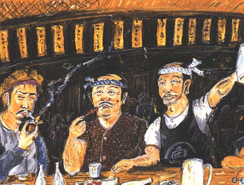 今年で55歳。平成4年までは建築設計・現場管理等、現在は電気建築関係の事務です。小学校の時から50歳を過ぎたら画家に、と思い中学の時は区展にもよく入賞してました。●平成4年5年と2度に渡り大手術を。気持ちが落ち込んでいたとき応募を思いついたが、苦しい気持ちを絵にするのはしのびなく、昔よく通った酒場の明るい人間模様を2日ほどで描き上げました。