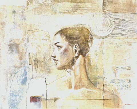 1954年兵庫県生まれ。武蔵野美術大学中退。現在、新世紀美術協会会員。●白い空間に浮かび上がる様々な色や形が集まって女性の横顔になって行くときの流れを、人間の愛を求めて描いています。
