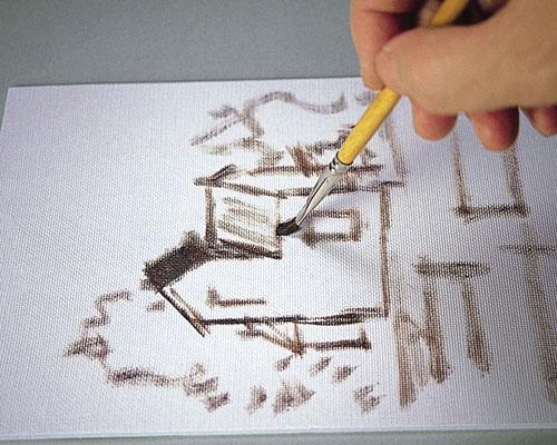 薄めた油絵具で輪郭線を入れる。木炭や鉛筆でもよい。