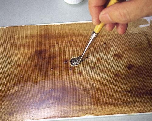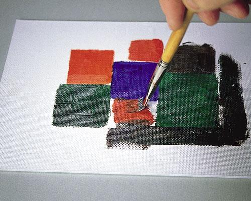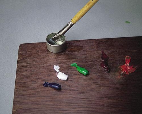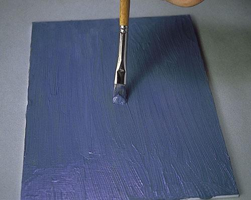 ポピーオイルのような粘りのある溶き油を使って、平筆で着彩するとフラットな画肌が得られる。