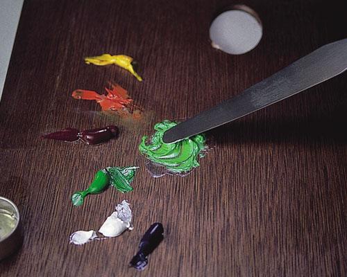 パレット上で溶き油を混ぜながらパレットナイフで混色する。