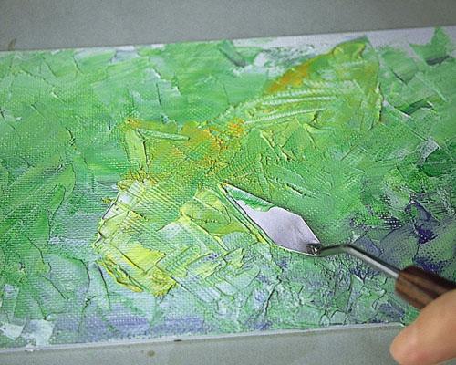 ペインティングナイフには絵具をのせて押すように塗ったりナイフの脇で取り除いたりと様々な技法がある。