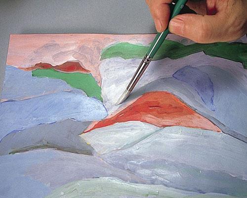 下の色が乾いたら同じ薄さに溶いた別の色を重ねる。下の色が透けて見え、透明な空気を感じさせるものになる。