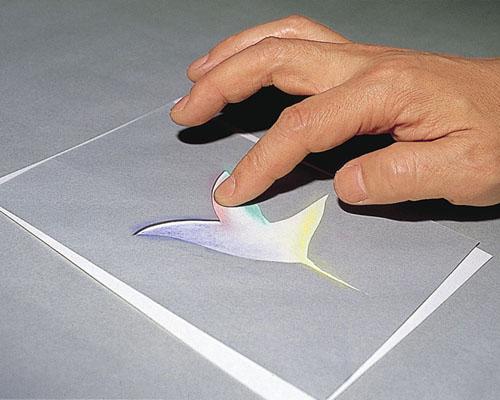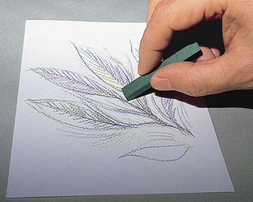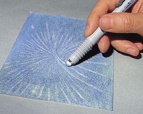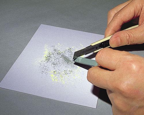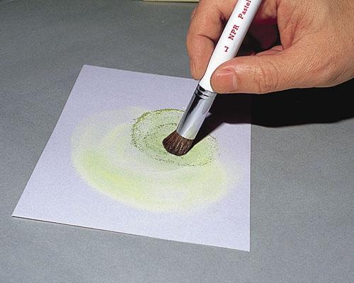 塗り痕を残さず広い面積を塗る場合は、一度粉末にしてから使います。指やティッシュペーパーでもよく伸びるが、パステルブラシを使えば、もっときれいに伸びる。