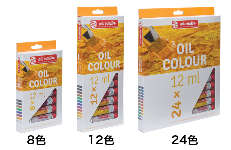 専門画材メーカー ロイヤルターレンスならではの油絵具がお手軽なパッケージで再登場です。定番の12色セットのほかに、ちょっと触ってみたい方向けの8色セット、じっくりと学んでみたい24色セットも加わり、ご興味に合わせて選んでいただけます。