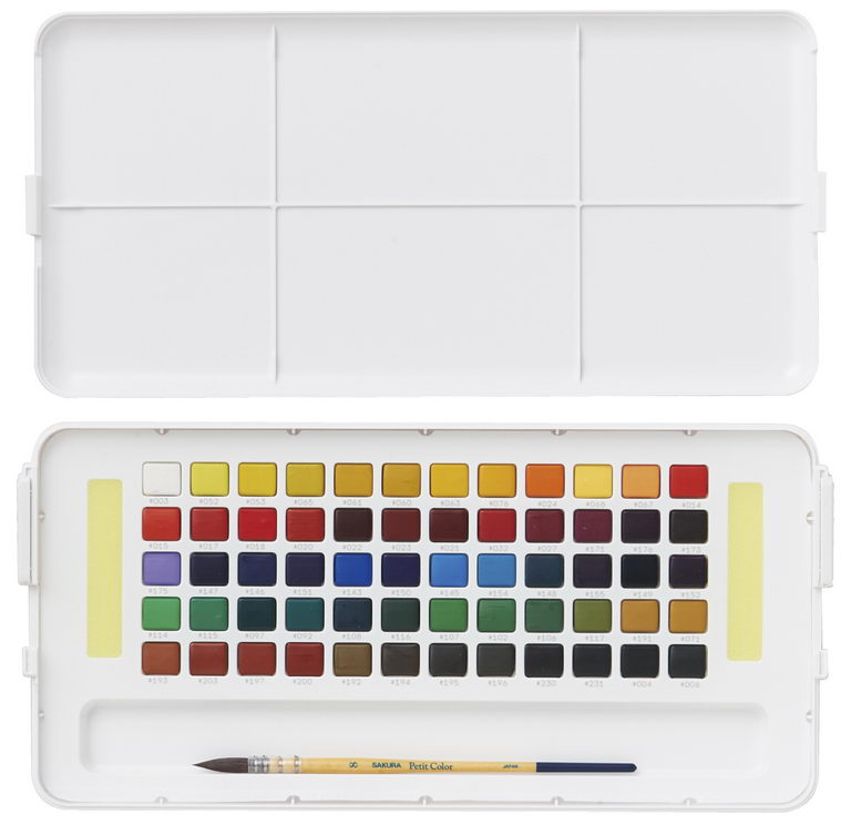 - 優れた発色の本格的固形水彩絵の具セットです。パレット、筆など、水彩画を描くのに必要なものを備えています。中仕切りの色番号と配色に対応した色見本(説明書)により色がわかりやすくなっています。豊富な色数によりなるべく混色せずに制作する事ができます。