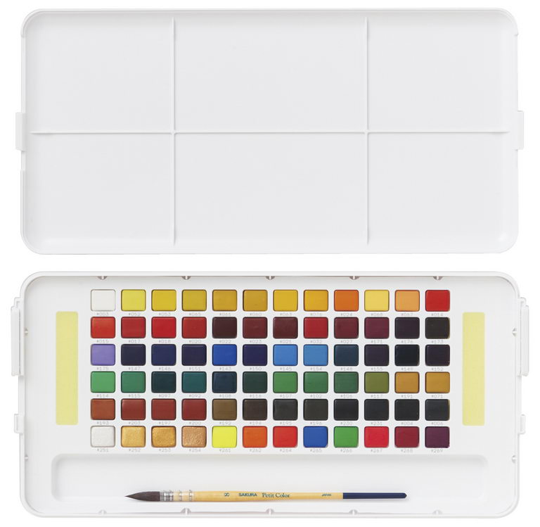 - ■セット内容固形水彩96色、プチカラー専用筆(穂先:PBT<縮毛>丸筆8号)、水彩筆(キャッツタン6号)、パレット2枚、カラーチャート■セット配色全96色