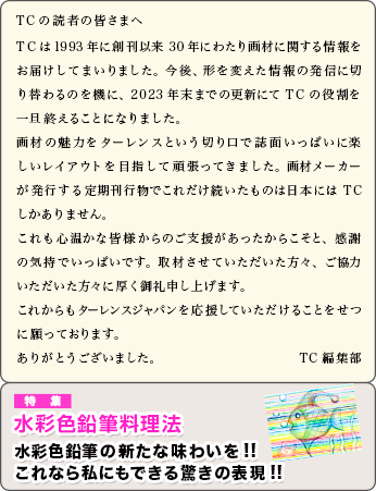 - TCは1993年に創刊以来30年にわたり画材に関する情報をお届けしてまいりました。今後、形を変えた情報の発信に切り替わるのを機に、2023年末までの更新にてTCの役割を一旦終えることになりました。
